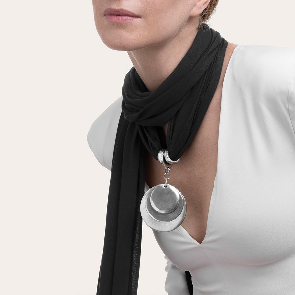 Lindo e charmoso, o echarpe Vestopazzo é feito com tecido e uma bela joia em formato de medalhas.