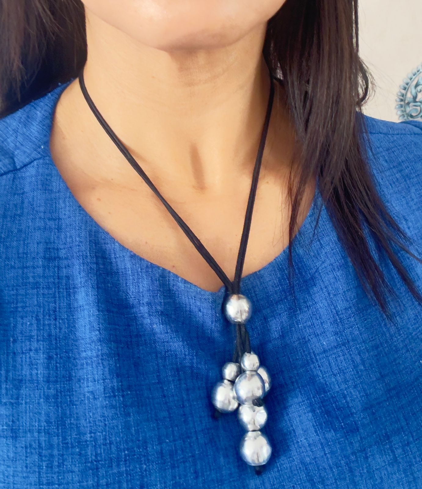 Colar com pêndulo de bolas de aproximadamente 3 cm, em alumínio 100% reciclado, que se alinham como pequenas esculturas sobre o peito, criando um colar que transmite força, equilíbrio e presença. Cada peça carrega uma suavidade robusta, como pedras roladas pela natureza. O cordão ajustável em fio encerado completa o design com leveza e versatilidade, tornando este colar perfeito para compor desde looks descontraídos até combinações mais marcantes.