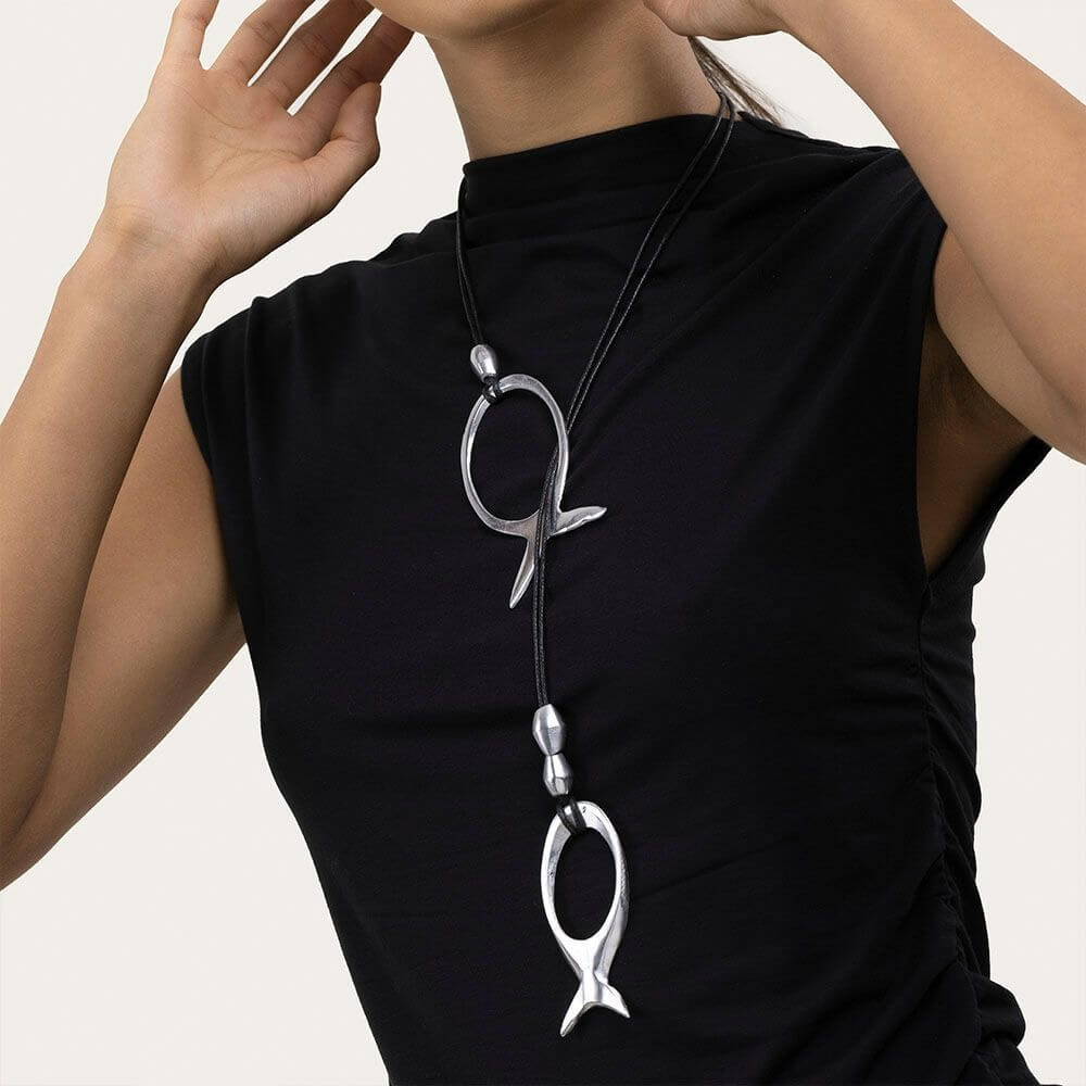 Apresentando um design de pingente pendente, com dois peixes vazados feitos em alumínio sustentável.
