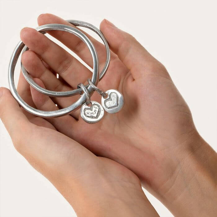 Moderna e descontraída, a pulseira é composta por duas argolas irregulares e dois pingente com desenho de coração.