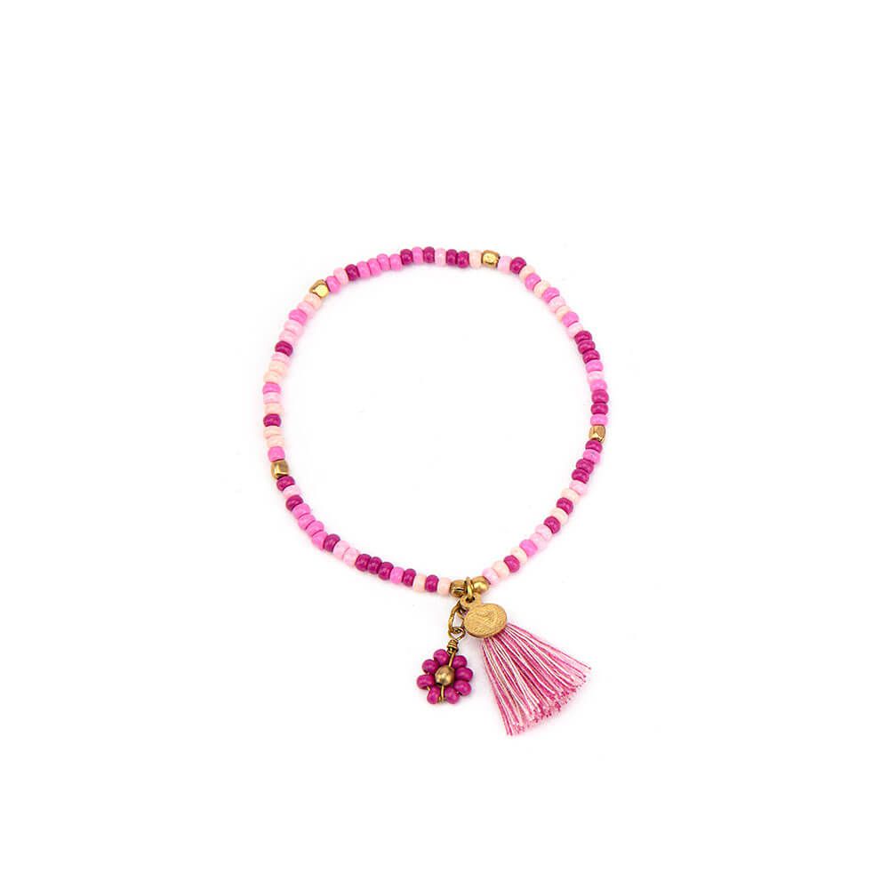 Pulseira delicada com florzinha de miçangas e pingente de tassel cor rosa